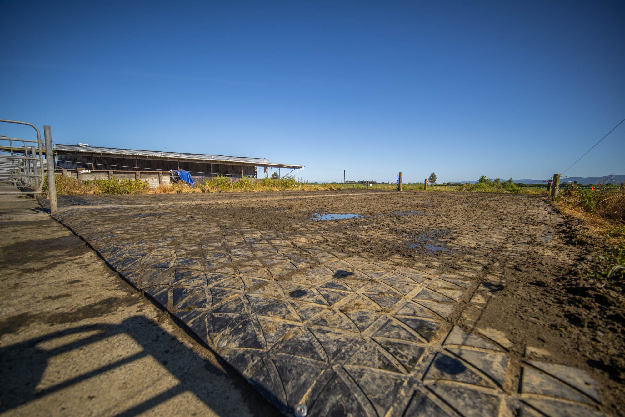 The tracks the cows were walking on were puggy and constantly full of mud, creating an uneven surface for their cows to walk on. When looking for a solution to repair the damaged tracks, Travis and his father-in-law discussed concreting the tracks, until realising they would only be pushing the affected area further along and they would still be dealing with pugging issues. Concreting the whole track into the shed would also become quite costly.