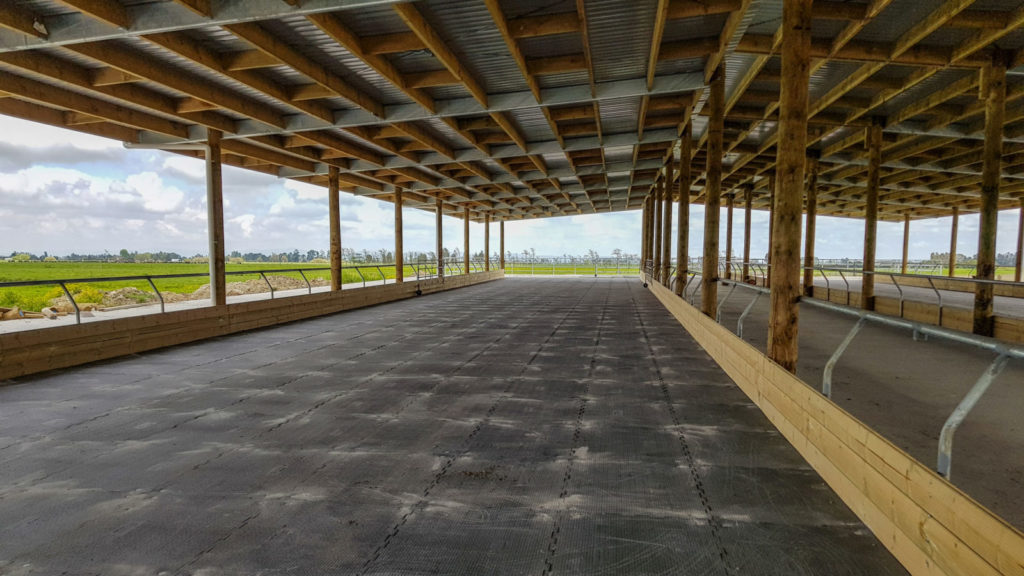 Prolonged rainfall and wet soil conditions, combined with high stocking density on paddocks, provides the ideal conditions for soil damage from pugging and soil compaction. Severe pugging and compaction lead to more topsoil and contaminant runoff to waterways and can cause further issues on the farm. Making sure that your soil is well-drained and has time to recover properly between grazing demands is incredibly important to good pasture management. To make sure your grass has enough time to recover, livestock must be moved elsewhere. Oftentimes animals are moved onto feed pads, stand-off pads, HerdHomes, or shelters. Concrete surfacing is commonly installed on these pads and shelters, but concrete is cold and hard. Not the most comfortable or safe surface to stand animals on for long lengths of time. Concrete can get slippery, and the hard surface can really take a toll on the hoof and joint health of the animals. One way to keep your animals off pasture for longer is by installing quality, purpose-built rubber matting on concrete stand-off surfaces.